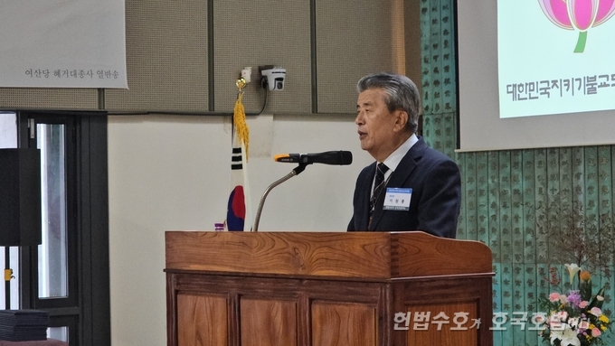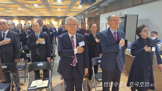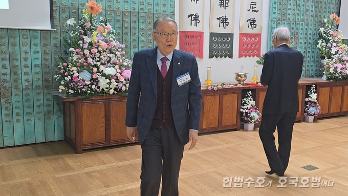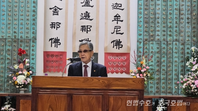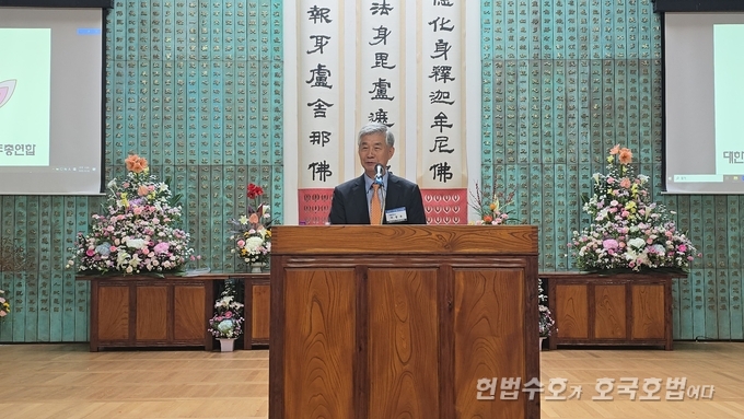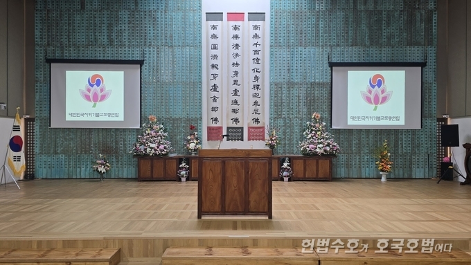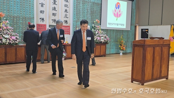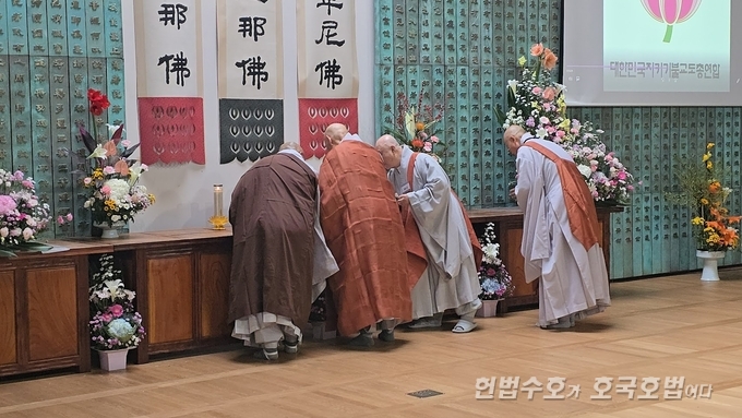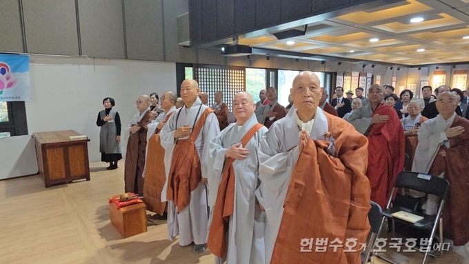 국민의례를 받들고 예불의식으로 삼귀의와 반야심경에 이어 호국호법실천발원문을 낭독한 후 대불총가를 제창하였다.