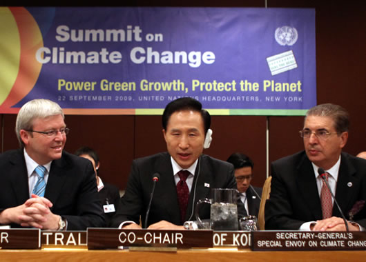 대통령 당선후 첫 유엔총회 연설, 22일 (현지시간) 유엔본부에서 열린 ‘기후변화 정상회의’ (Summit on Climate Change) 제1원탁회의 공동의장 자격으로 사회를 맡아 27개 국가 정상 및 각료급 대표들과 토론을 벌였다. SCC (기후변화정상회의) 정상회의는 모두 8개 그룹으로 나누어져 열리는데 제1원탁회의는 유엔총회 개막 후 첫번째 열리는 회의이며 그 첫 회의에 공동의장을 맡았다는 사실은 한국의 위상이 유엔에서 그만큼 높아졌다는 것을 의미한다. ▲ SCC(기후변화정상회의) 정상회의에서 첫 회의에 공동의장을 맡은 이명박 대통령- 사진 왼쪽은 공동의장 케빈 러드 호주총리 공동의장에는 케빈 러드 호주 총리가 자리를 함께 하고 있다. 이 자리에서 이명박 대통령은 ‘개발도상국가들의 온실가스 감축행동 (NAMA) 을 유엔기후변화협약 사무국에 등록하도록 하는 등록부 (NAMA Registry)를 설치하자’고 제의했다. 이 제안은 선진국가들과 개발도상국가들 사이의 의견 차이로 교착상태에 빠진 온실가스 감축 문제를 풀어 나가기 위한 한국측의 중재안이다. 이번 SCC 회의는 오는 2012년에 만료되는 ‘교토의정서’를 대체하기 위해 오는 12월 덴마크 코펜하켄에서 열리는 ‘유엔기후변화협약 (UNFCCC)’ 국가들의 총회에 앞서 미리 의견 조절을 위해 열린 것이다. UN은 지난 1992년 “지구촌 주민들은 모두가 환경 파괴에 대한 공동부담 의무가 있다”는데 무게를 둔 책임을 강조하는 협약을 154개 나라가 서명 맺은 바 있다. 그런데 올 유엔총회에서도 180여 나라의 정상,각료들이 참석 유엔사상 최대의 총회가 열리고 있으나 선진국과 후진국가들 사이에 갭이 깊어 타결될 전망은 보이지 않고 있다. 미국 일본 프랑스 독일 등 EU 국가들은 개발도상의 선두를 달리고 있는 중국, 인도에 대해 온실가스 감축에 관한 구체적인 프로그램을 제시하라고 요구하고 있다. 그러나 중국과 인도 개발도상국가들은 ‘선진국가들이 좀더 획기적인 온실가스 감축목표를 세우고 기술을 후진국가들에게 넘겨 달라’고 요구하고 있다. 그 때문에 미국은 ‘교토의정서’를 외면하고 왔다. 그런 교착상태를 풀기위해 이명박 대통령은 “개발도상국가들의 감축 행동을 유엔이라는 국제적인 협약에 구속하지 말고 유엔기후변화협약 사무국에 등록부를 만들어 각 나라가 자발적으로 기재하도록 함으로써 자발적인 온실가스 감축을 이룩해 나가자”고 중재안을 내 놓은 것. 이 제안에 대해 토드 스미스 미국측 특사는 21일 뉴욕타임스와 가진 인터뷰에서 “코리아 대통령이 제안한 중재안은 선진국가와 개도국 나라의 갭을 줄이는 유용한 제안”이라고 칭찬했다. 한편 이명박 대통령은 한국 대통령의 입장에서 “코리아는 온실가스 의무 감축 국가는 아니지만 2020년 까지 중기 목표를 설정하고 매년 국내총생산 (GDP) 의 2%를 녹색기술에 투자할 방침”이라고 밝혔다. 李 대통령은 지난 21일 뉴욕타임스와 인터뷰 하면서 “선진 국가들은 온실가스 감축에 따른 기술을 후진국가들에게 나누어 주어 공유할 의무가 있다. 또 개도상 국가들도 비용을 부담할 자세가 되어 있어야 한다. 그래야 후발 개도상 국가들도 기후변화문제는 피해갈수 없다는 과제를 인식하게 된다”고 말했었다. 유엔의 SCC 회의는 1992년 체결된 ‘UN기후변화협약’ (USFCCC)이 만들어낸 국제간 협약이다. 1992년 6월 브라질 리우데자네이로에서 열린 ‘리우환경회의’에서 체결된 이 협약은 이산화탄소를 비롯한 온실가스 방출을 제한하는 것에 주요 목적을 두고 있다. 리우 환경 회의에는 178개 나라가 참가 했으며 미국 일본 한국을 비롯 154개 나라가 서명 했다. 이에 따라 1994년 3월부터 효력이 발생했다. 리우에서 서명 당시 이미 선진국가 대열에 올라선 유럽 공동체 (EU) 국가들은 “구속력이 강한 규제법으로 만들어야 한다”고 요구했으나 온실가스 상품을 많이 생산하는 미국 일본 한국의 반대로 “강제성이 없는 노력하는 행동 규범”으로 약화시켰다. ‘리우 협약’ 은 서명한 154개 나라가 모두 강제적으로 지켜야 하는 공통의무 사항과 나라별 상황에 따라 일부 국가만 부담하는 특정 의무사항으로 나누어져 있다. ▲ 온실가스 배출 감소를 위한 국가전략 수립 ▲ 전략 시행과 결과 공개 ▲ 온실가스 배출.흡수량 통계 보고서 작성은 공통 의무사항이다. 또 특정 의무사항은 국가별 경제, 기술경쟁력을 기반으로 나뉜다. 경제개발 협력기구 (OECD) 가입 국가들과 미국과 EU 국가들인 선진국가들이 이 온실가스를 먼저 줄이고 개발도상국가들에게는 기술과 자금을 지원하는 방식이다. 이에 따라 한국도 온실가스 감축에 따른 문제가 없는 것은 아니다. 철강, 시멘트, 화학, 농약, 자동차 공업 등 온실가스 문제를 외면할 수 없는 기업들을 갖고 있다. 거기에 세계 경제규모 10위권 국가에 올라서 있다. 선진국가들과 개발도상국가들로부터 양쪽 모두 공격을 받을 수 있다는 점을 깨달아야 할 것이다. ㅁ 손충무 –국제저널리스트.www.usinsideworld.com –편집겸 발행인 |